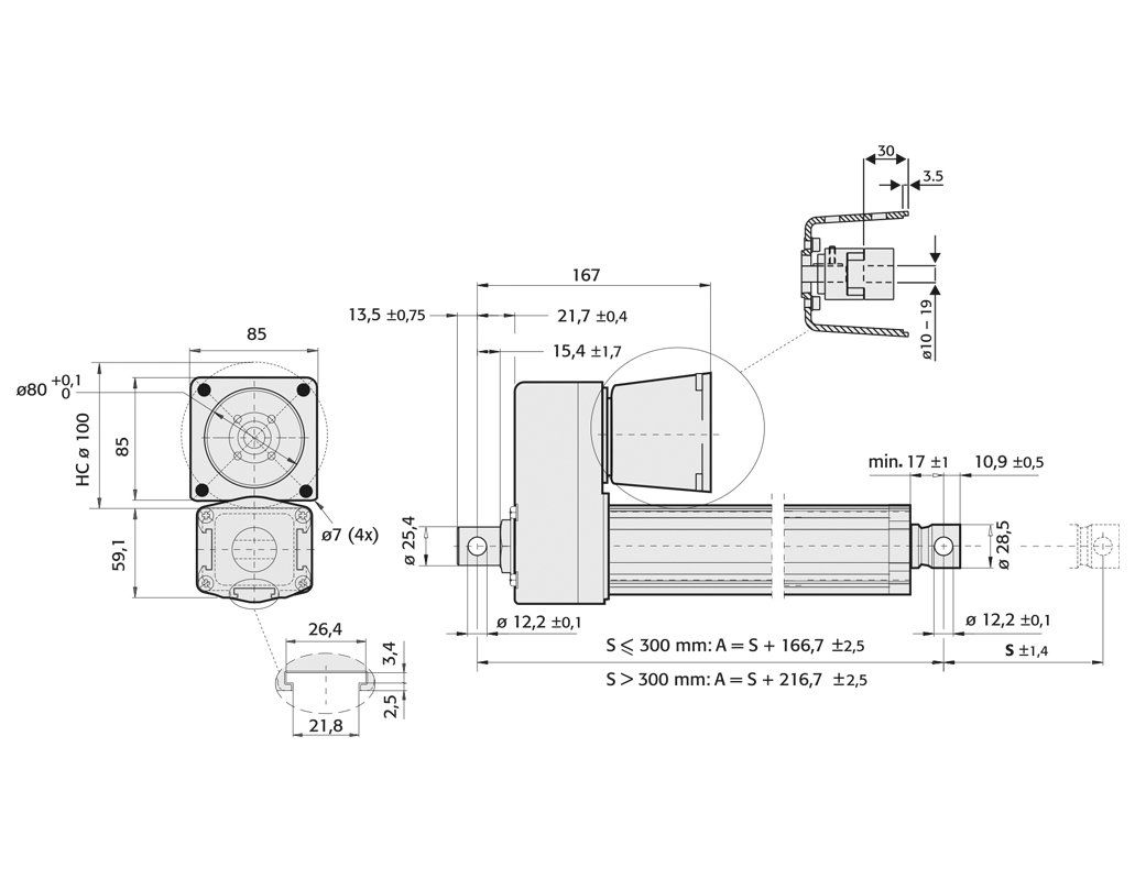 - Abmessungen: Alle FA14 Zylinder mit Trapezgewindetrieb sind baugleich