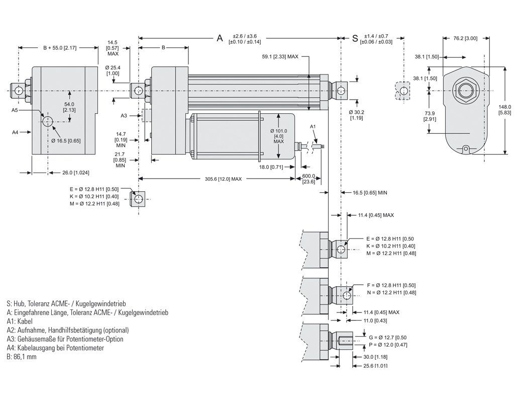 - Gewindetyp: Trapezgewinde (A) oder Kugelgewindetrieb (B)