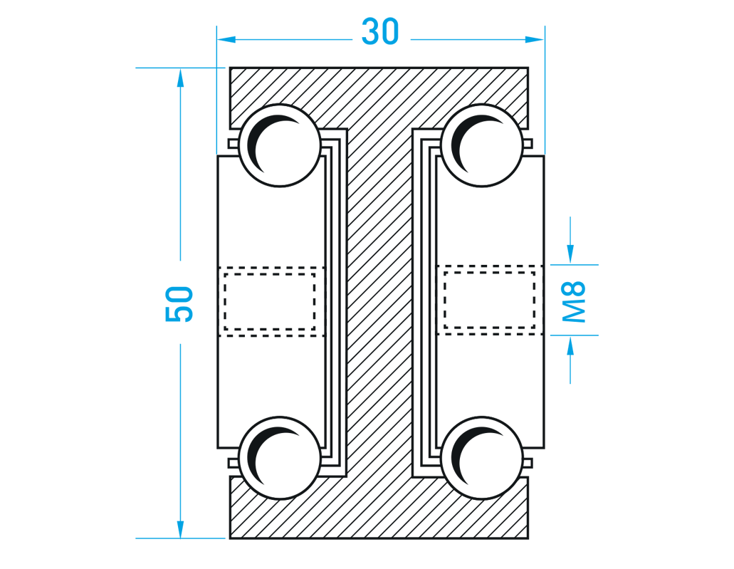 Single full-extension rail with dimensions of 50×30 mm, designed for heavy-duty applications. The material is not hardened. Load capacities are calculated for a service life of 100,000 cycles at full load. We supply these rails in C45 steel or, upon request, in aluminum or stainless steel.