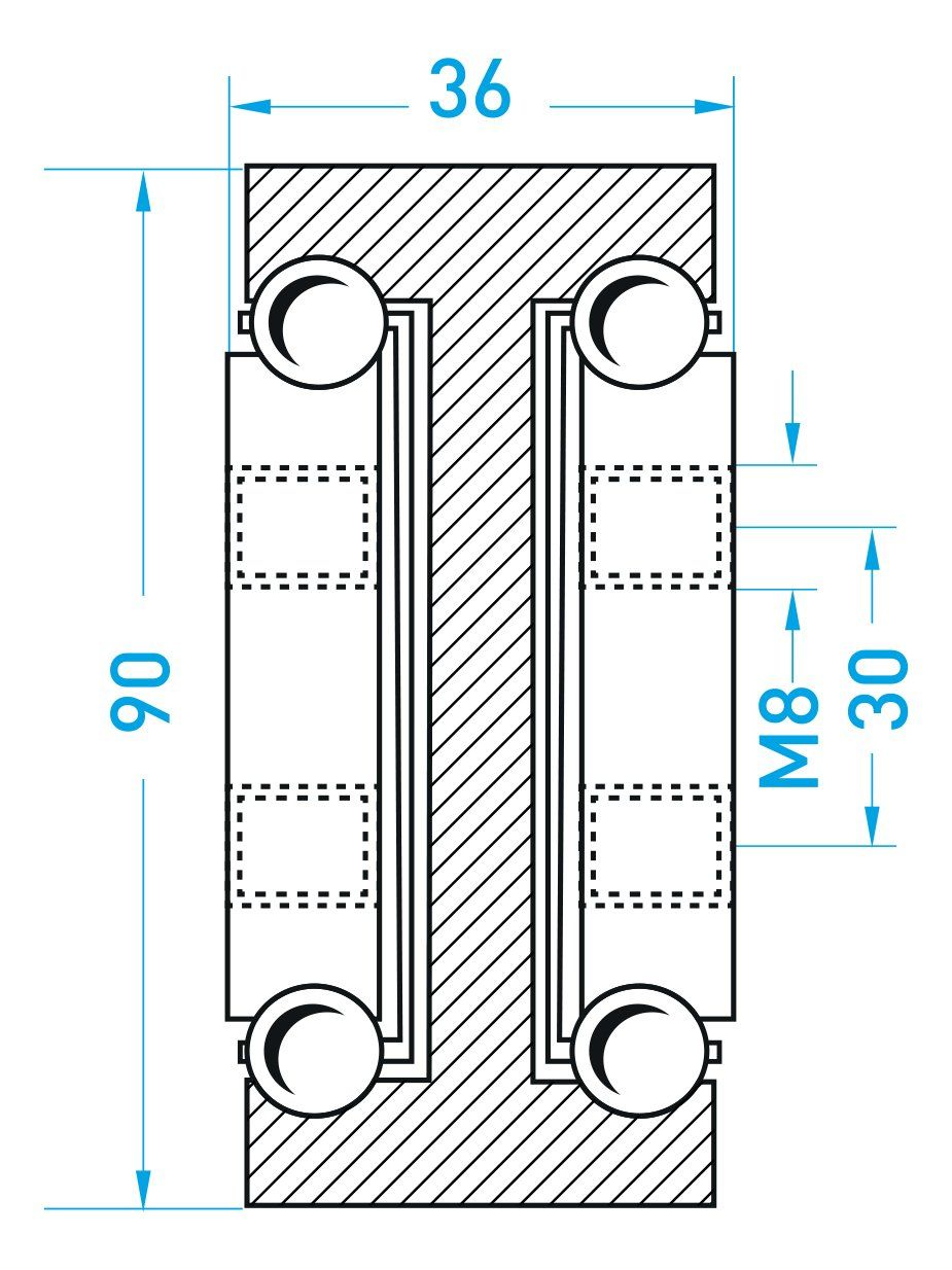 Single full-extension rail with dimensions of 90×36 mm, designed for heavy-duty applications. The material is not hardened. Load capacities are calculated for a service life of 100,000 cycles at full load. We supply these rails in C45 steel or, upon request, in aluminum or stainless steel.
