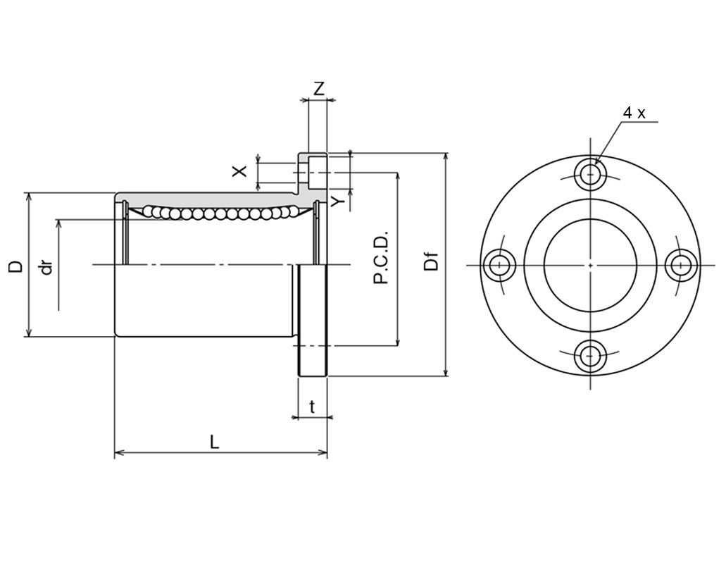 | Type (Lintec) | Nippon Bearing | dr (mm) | D (mm) | L (mm) | Df (mm) | PCD (mm) | Cdyn (N) | Cstat (N) |