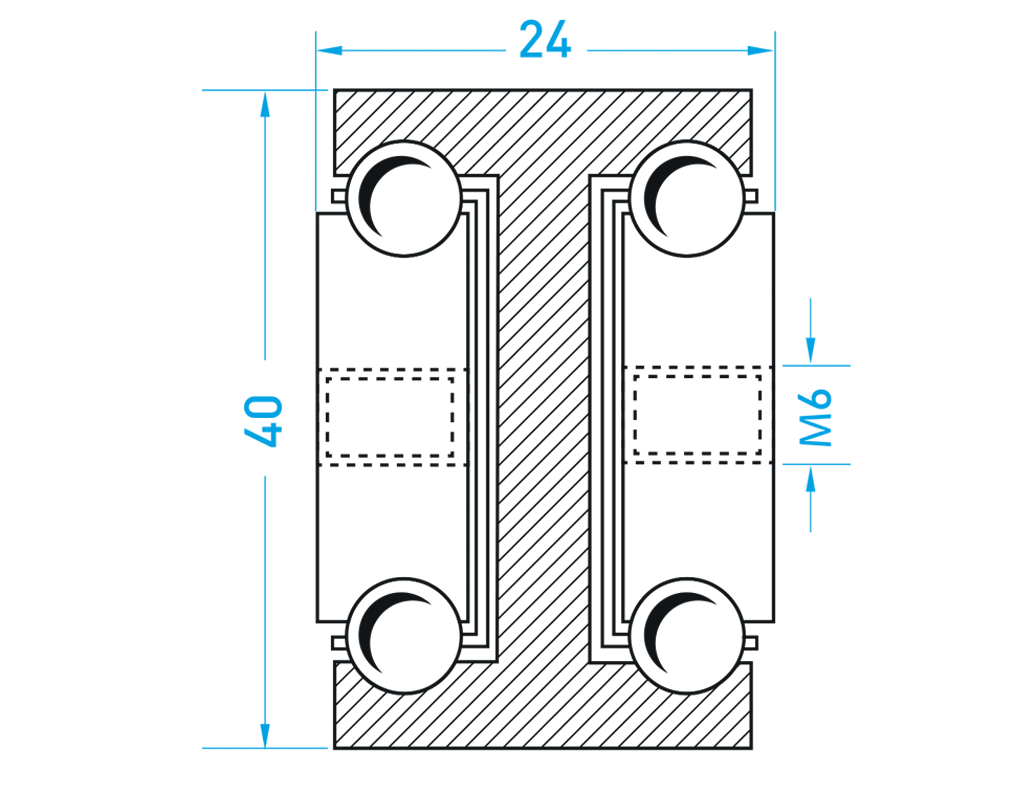 Einfacher Vollauszug in den Abmessungen 40×24 mm. Die Schienen sind für große Lasten. Das Material ist nicht gehärtet. Die Tragzahlen sind auf eine Lebensdauer von 100.000 Hüben unter Vollast berechnet. Diese Schienen liefern wir im Material C45 oder in Absprache auch in Aluminium oder Edelstahl.