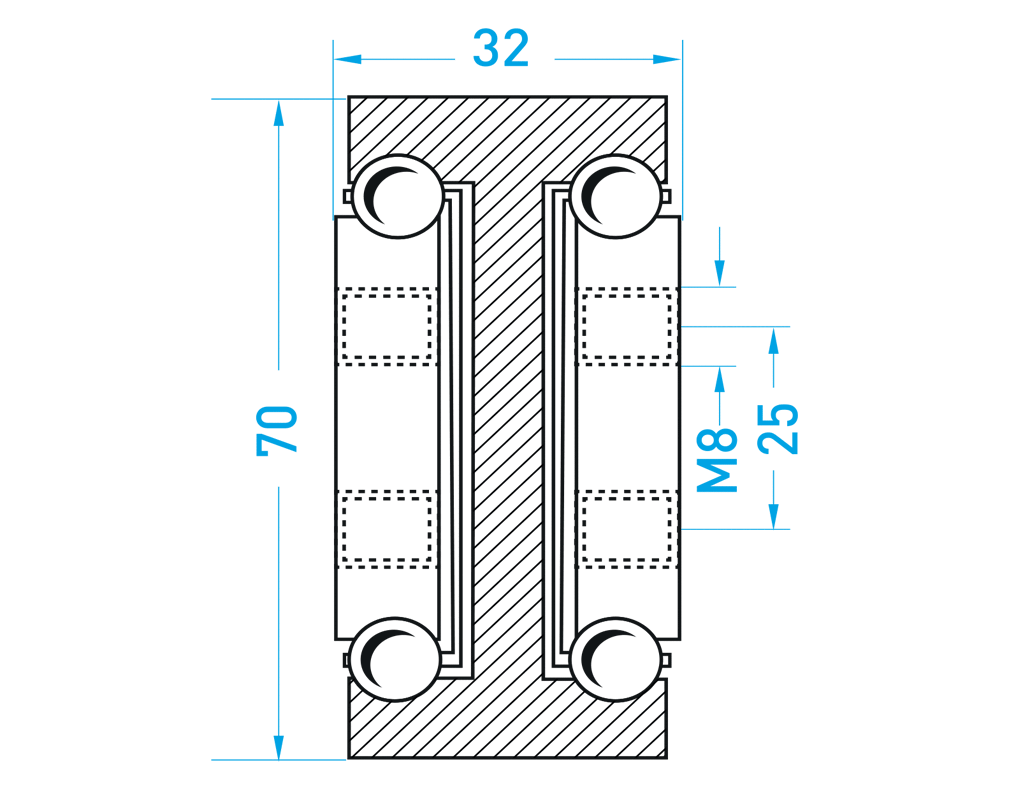 Einfacher Vollauszug in den Abmessungen 70×32 mm. Die Schienen sind für große Lasten. Das Material ist nicht gehärtet. Die Tragzahlen sind auf eine Lebensdauer von 100.000 Hüben unter Vollast berechnet. Diese Schienen liefern wir im Material C45 oder in Absprache auch in Aluminium oder Edelstahl.